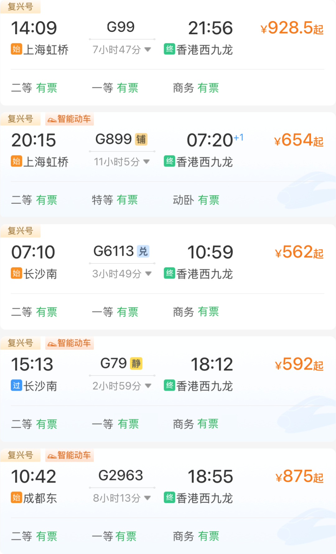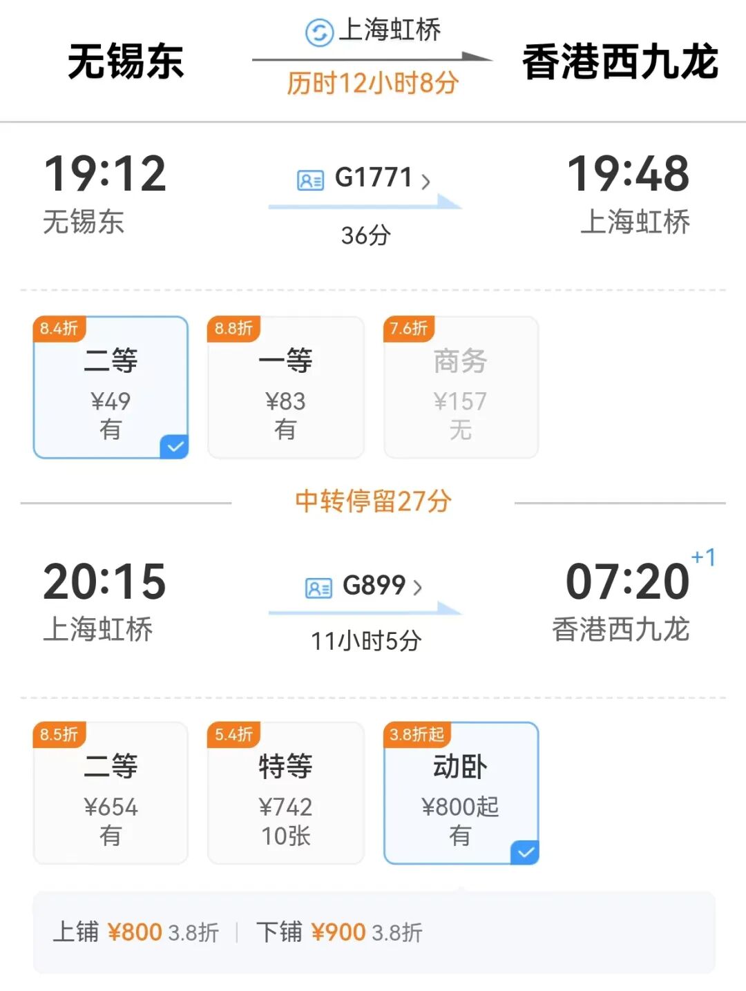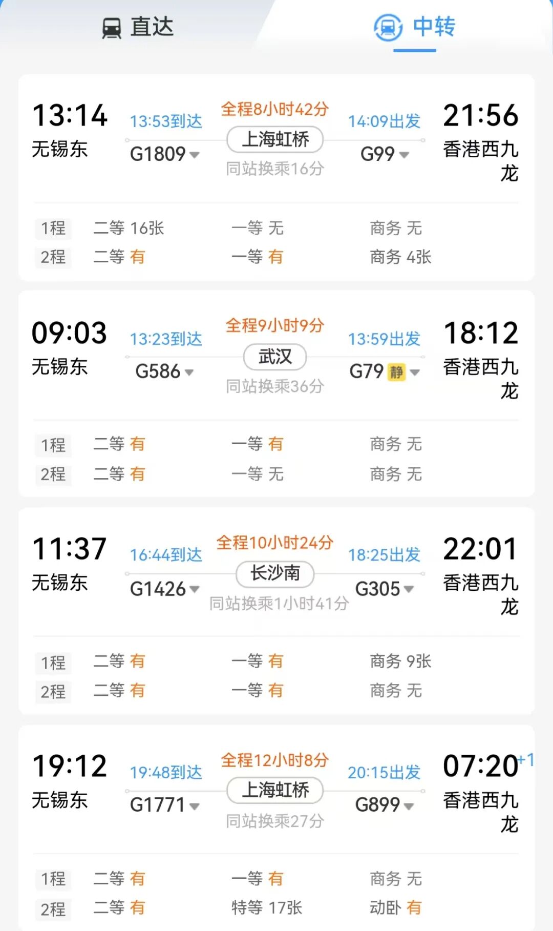 一定有小伙伴要问了从无锡坐高铁去香港需要多长时间?小布通过铁路12306APP查询到通过上海虹桥站中转最快仅需8小时42分