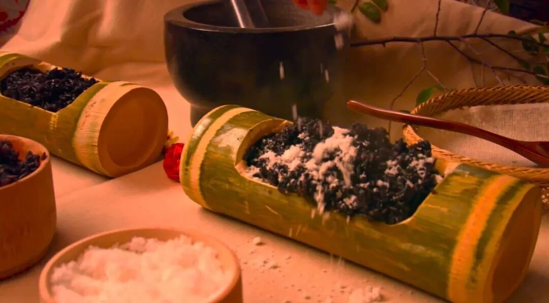 竹筒盛着乌米饭上桌了,撒上白糖,趁热吃。