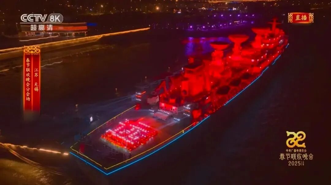 古运河的粼粼水波倒映着霓虹灯光,好一幅“人家尽枕河”的民俗风情画,一艘宏伟的轮船停泊在古运河之中,它正是春晚分会场的造景之一,黄鹄号。
