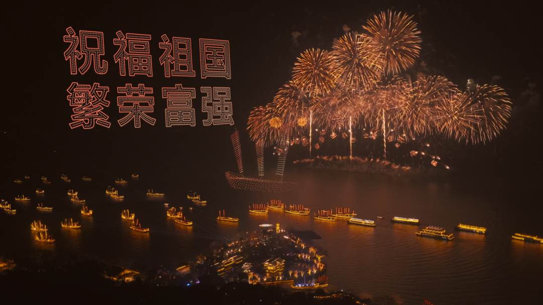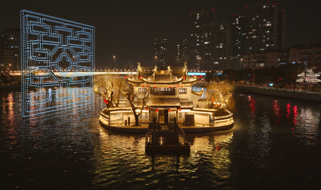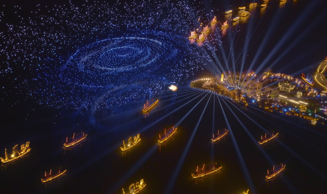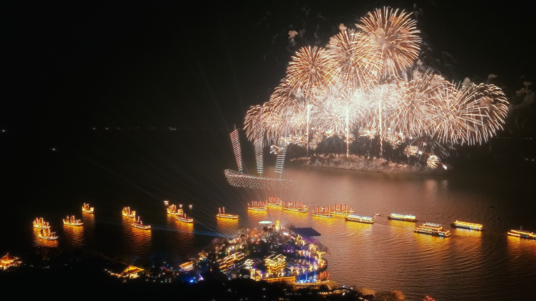 空中,无人机编队先后组成太湖水面、“巳巳如意”纹样与巨型帆船,烟花腾空而起,与无人机共舞上演视觉盛宴。
