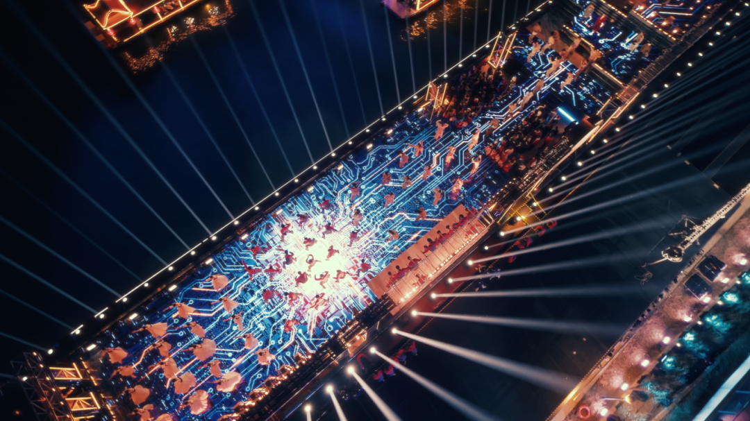 工业大船的地屏上,激光秀联动船体影像,组成超级计算机数据链、芯片电路、智能制造流水线的复杂编程以及物联网万物互联的通路,千丝万线、连接四方。