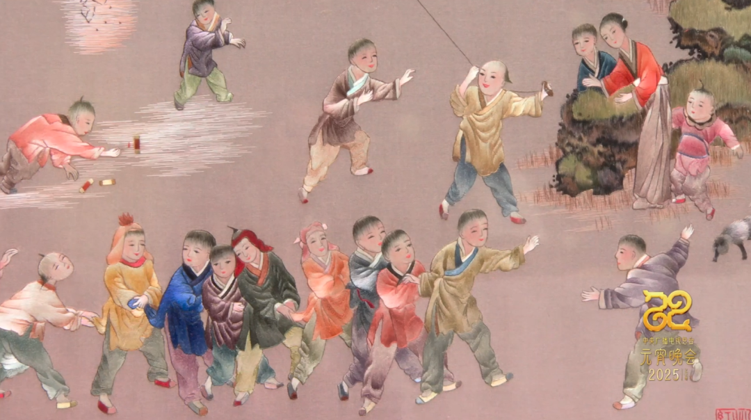 双面精微绣《童子嬉春图》,作品描绘的是新春时节童子嬉戏玩乐的场景,孩童们三五成群,有的在放鞭炮、有的在捉迷藏,有的在放风筝,把孩童顽皮好动,欢快与喧闹之情景表现得淋漓尽致。作品绣工精细,色彩丰富,不同颜色的丝线精心搭配出柔和高雅之感,把玩耍中的儿童刻画得形象生动,神态各异,惟妙惟肖,呈现出一群天真无邪的孩童庆贺新春的浓厚民俗风情。