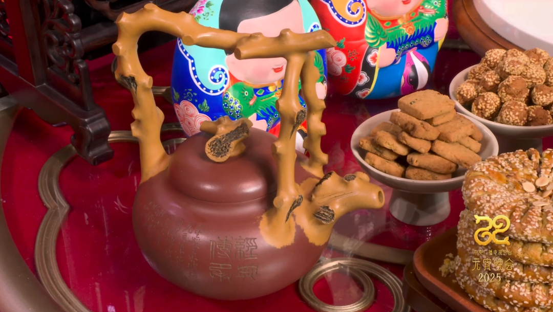 桌上这把宜兴紫砂壶名为《东坡提梁壶》。此件作品是范伟群先生根据其祖父范钦仁的原作摹古再制。《东坡提梁壶》取材自然,立意淳朴。壶身饱满圆润,充满张力,树枝形的壶流、壶钮形态逼真。自然生动。三叉提梁的树杆苍劲老道,疤节自然,浑然天成,拿捏舒适。