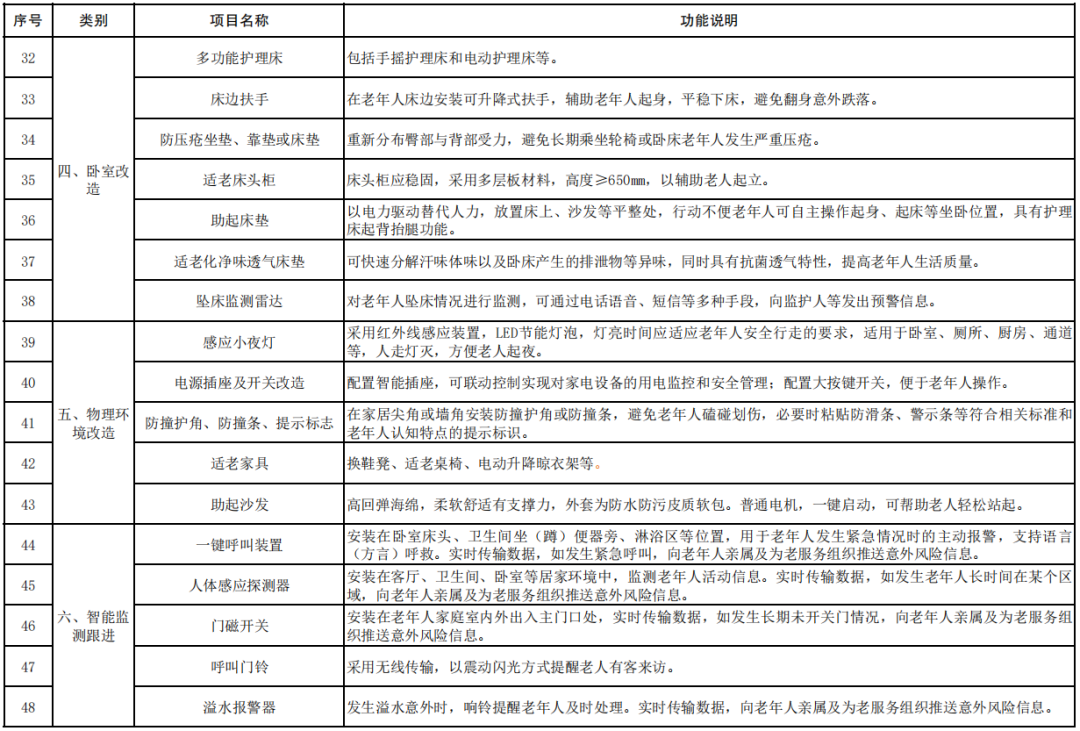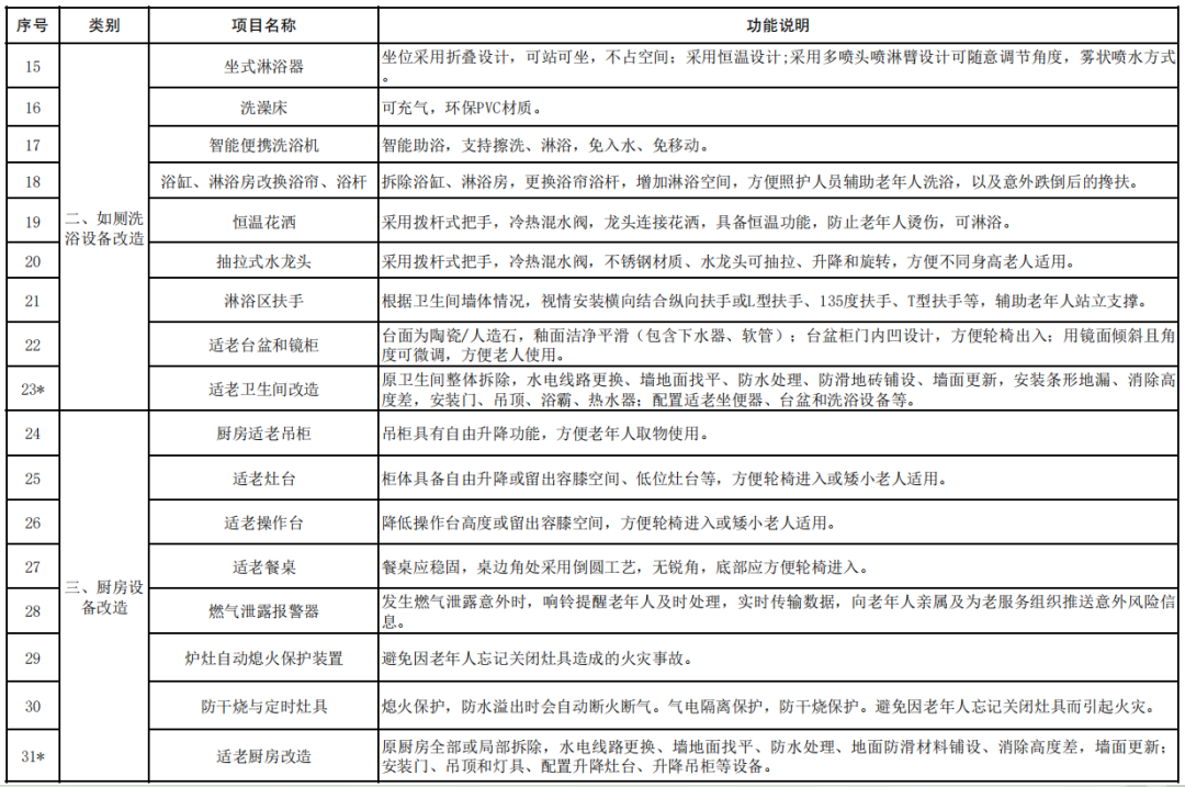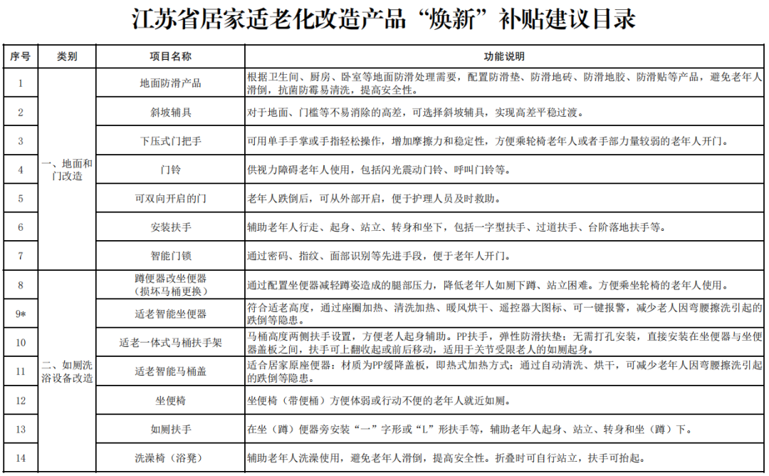 围绕“地面和门改造、如厕洗浴设备改造、厨房设备改造、卧室改造、物理环境改造,智能监测跟进,适老辅具适配”等七大方面,对江阴市内有需求的老年人家庭购置居家适老产品提供优惠政策,提升老年人生活品质。