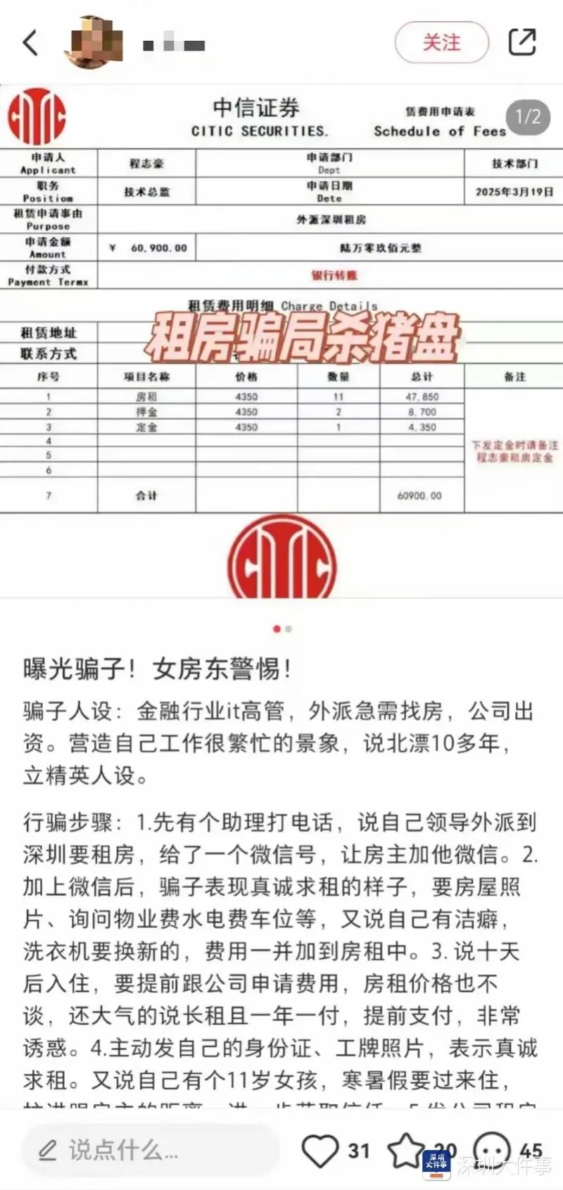 租客对房子的情况过问较少,而是先发一张“公司的租房申请单”,上面有公司信息和身份证等个人信息,进而获取信任。但接下来,租客会以向财务走流程为由,迟迟不给诚意金和租金,在等待过程,主动找房东聊天,先聊生活,偶尔植入工作信息,逐步树立起这样的形象:工作体面——证券公司、科技大企婚姻状况——离异带娃、女儿懂事听话租房事由——公司业务所需,租金报销、三年起步,不讨价还价有着“想着给钱的都不怕,收钱的怕啥”的心理,一般房东都会放下戒备,就把合同签了,就算收不到租金,大不了不租了,似乎也没损失啥。特别是房子不好出租的房东,反正也没租客,房子闲着也是闲着,这个还愿意一次性付三年租金,“万一真的是好运气遇到优质租客了呢”。 恰恰是这个“聊天”过程,埋下了“杀猪盘”的隐患。根据网友分享的经历,“租房杀猪盘”诈骗套路,一般如下——1精准筛选目标骗子通常在 58同城、安居客、小红书、闲鱼等平台寻找发布租房信息的房东,尤其是闲置房产较多、经济条件较好的房东。他们会避开中介,直接联系房东,以“长租、公司报销、不议价”等条件吸引房东注意。2伪造“完美租客”人设职业包装:自称证券公司员工、IT金融精英等,提供虚假工作证、身份证(实为PS或盗用他人信息)。情感攻势:嘘寒问暖、分享生活照片,甚至以“单身优质男/女”人设博取信任,部分骗子还会寄送小礼物进一步拉近关系。3以“租房”为由建立信任承诺高额租金:主动提出一次性付清1-3年租金,甚至愿意支付“诚意金”,但实际以公司走流程为由拖延付款。拒绝实地看房:借口“人在外地”“工作调动”等,仅要求房东提供房屋视频或照片,甚至连房子照片都不用看,避免线下接触。4诱导投资,实施诈骗透露“投资内幕”:声称发现证券、黄金、数字货币等投资漏洞,或利用“大数据分析”稳赚不赔。让房东“帮忙操作”:以“出差无法登录”为由,让房东登录虚假投资平台操作其账户,展示“高额盈利”假象。诱导房东自己投资:前期允许小额提现,待房东加大投入后,以“系统维护”“缴税”等借口冻结账户,最终卷款跑路。5最终收割,消失拉黑当房东投入大额资金后,骗子会突然失联,或编造新理由要求继续转账(如“补缴保证金”),直到房东醒悟。警方提醒针对瞄准房东的新型杀猪盘,早在2023年,不少地方的警方都发布过受骗案例和提醒,一直到近期,依然有警方在发布提醒。