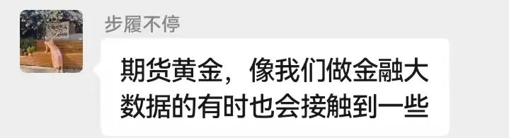 嘘寒问暖之后,开始露出真面目,开始谈投资赚钱,“那有什么消息我也分享给姐”、“期货黄金,像我们做金融大数据的有时也会接触到一些”。