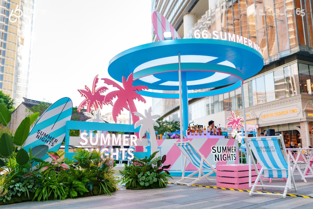 现场布置起了椰林装置,一张张沙滩椅依次排开,还有环形饮品吧台,吧台上摆满了高颜值的美食与沁爽特调冰饮,配合着乐队演出,邀请大家共赴一场精彩的仲夏夜派对。充满文艺范的空间设计、琳琅满目的艺术品、精心策划的文艺活动,既丰富了商业中心的功能,又提升了城市生活的品质。
