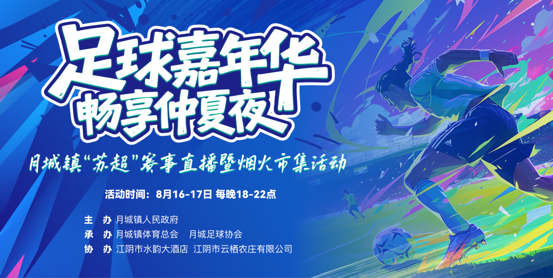 8月16日—17日18:00—22:00,“足球嘉年华 畅享仲夏夜”月城镇“苏超”赛事直播暨烟火市集活动将在月城民生广场盛大启幕,看足球、品美食、逛夜市……精彩活动不容错过!