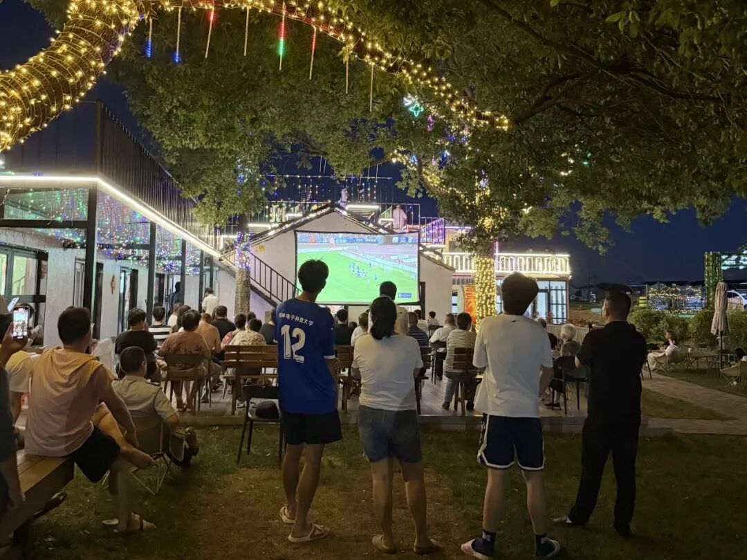 璜土生态园广场的观赛大屏前,自带小板凳,看球的同时还能赏夜景,惬意又自在。