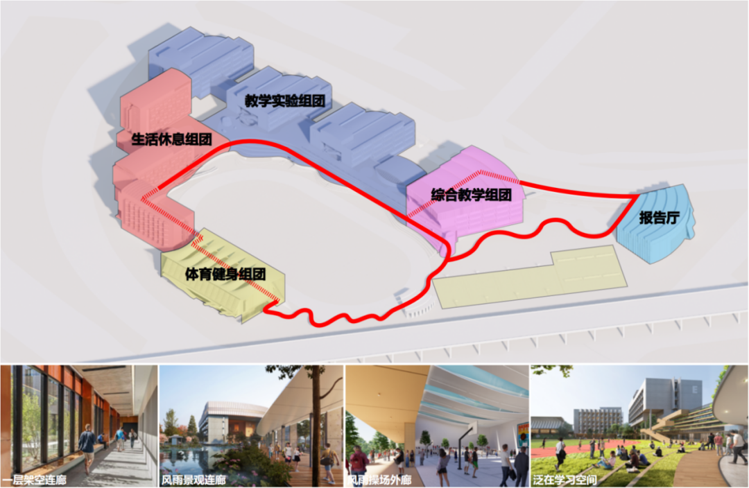 互联互通的空间设计:通过宿舍架空层、体育馆外廊、风雨连廊和学习连廊,将各功能组团衔接成环,建筑既独立又相互串联。