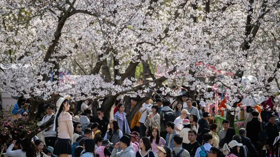 景区内不仅赏樱、乘游船的游客络绎不绝,吃面队伍更是排起长龙,成为清明首日的独特风景线。