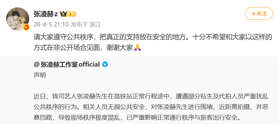 4月5日,@张凌赫工作室official 发声明,抵制私生及代拍行为: