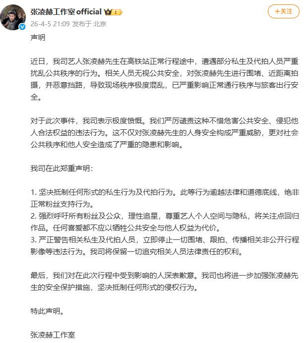近日,我司艺人张凌赫先生在高铁站正常行程途中,遭遇部分私生及代拍人员严重扰乱公共秩序的行为。相关人员无视公共安全,对张凌赫先生进行围堵、近距离拍摄,并恶意挡路,导致现场秩序极度混乱,已严重影响正常通行秩序与旅客出行安全。