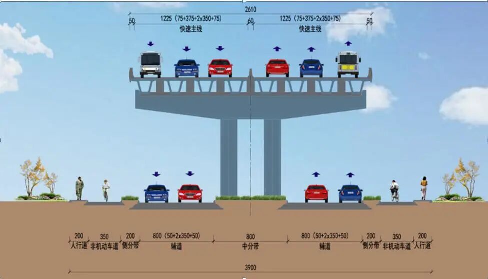 锡暨大道采用主线高架加地面辅道的形式建设,主线为城市快速路标准,双向6车道,设计行车时速80公里,地面辅道为城市主干路标准,双向4至6车道,设计时速50至60公里。