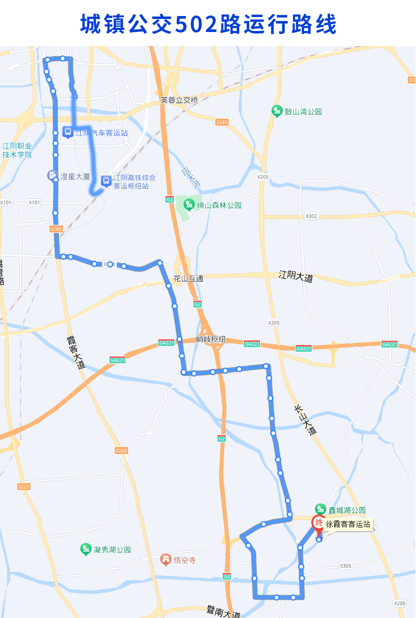 调整后的城镇公交502路由江阴高铁站始发,经大桥南路、花山路、立新路、虹桥南路、环城南路、环城西路、梅园大街、霞客大道、云南路、花峭路、人民路、峭璜路、外环北路、外环西路、外环南路、环东路、须毛路、外环东路至终点站徐霞客客运站。