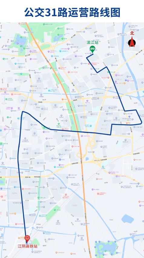 31路优化调整后,“钢材市场”站点更名为“东翎府”站点;新增停靠“碧桂园暨阳府”“碧桂园紫宸”“江阴高铁站”站点;取消停靠“立新路”“公交总站”站点。