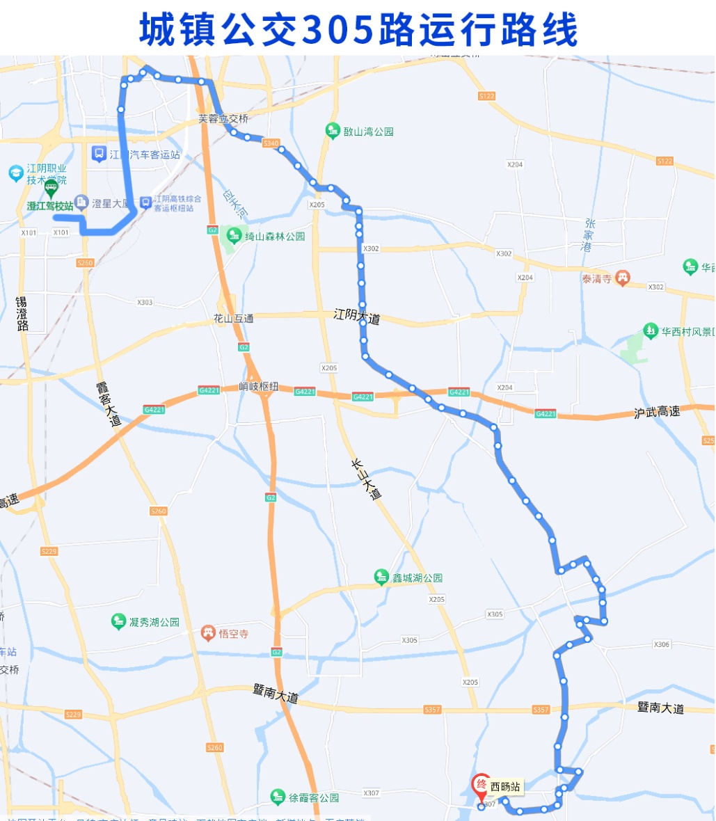 调整后城镇公交305路由澄江驾校站始发,经站西路、霞客大道、大桥南路、花山路、环城南路、文定路、人民东路、大桥南路、澄杨路、山庄路、太平路、云顾路、长寿路、云顾路、环北路、人民南路、镇南路、云顾路、北前路、环西路、华昌路、锡文路、人民路、文化路、环南路、马文路至终点站西旸站。