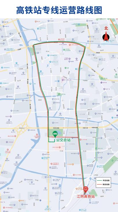 早班线路走向:早上班车由公交总站发车区始发,沿梅园大街—环城西路—环城北路—环城东路—花山路至江阴高铁站。