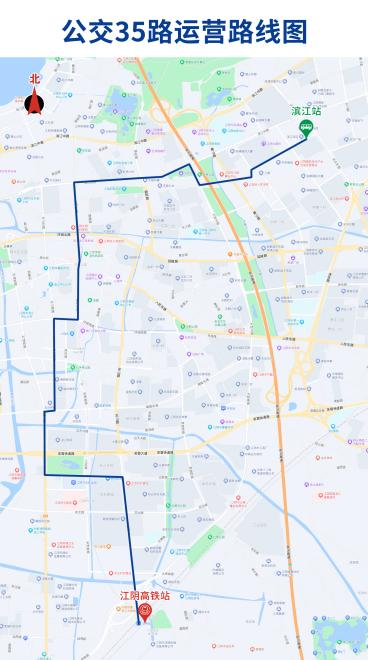 公交35路由滨江车站始发,上行沿文化路—大桥路—澄江路—虹桥路—环城南路—中山南路—毗陵路—梅园大街—立新路—花山路—西桥路至江阴高铁站。下行按原线行至立新路后,沿立新路—梅园大街—芙蓉大道辅道—虹桥南路—毗陵路—中山南路至原线。