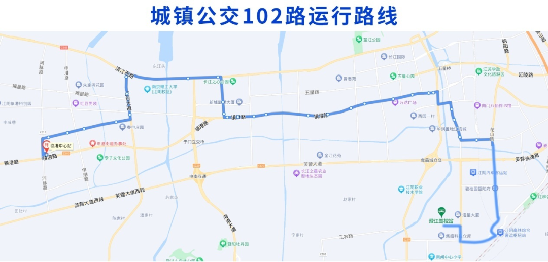 调整后城镇公交102路由澄江驾校站始发,经站西路、大桥南路、花山路、毗陵东路、梅园大街、环城西路、人民西路、通渡北路、滨江西路、亚包大道、崇文路、河豚路至终点临港中心客运站。
