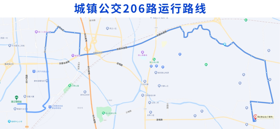 调整后城镇公交206路由澄江驾校站始发,经站西路、霞客大道、大桥南路、花山路、环城南路、文定路、人民东路、大桥南路、芙蓉大道、龙定路、东尚路、御龙路、芙蓉大道、光辉路、周庄西大街、世纪大道、龙山西路至终点站周庄客运站。
