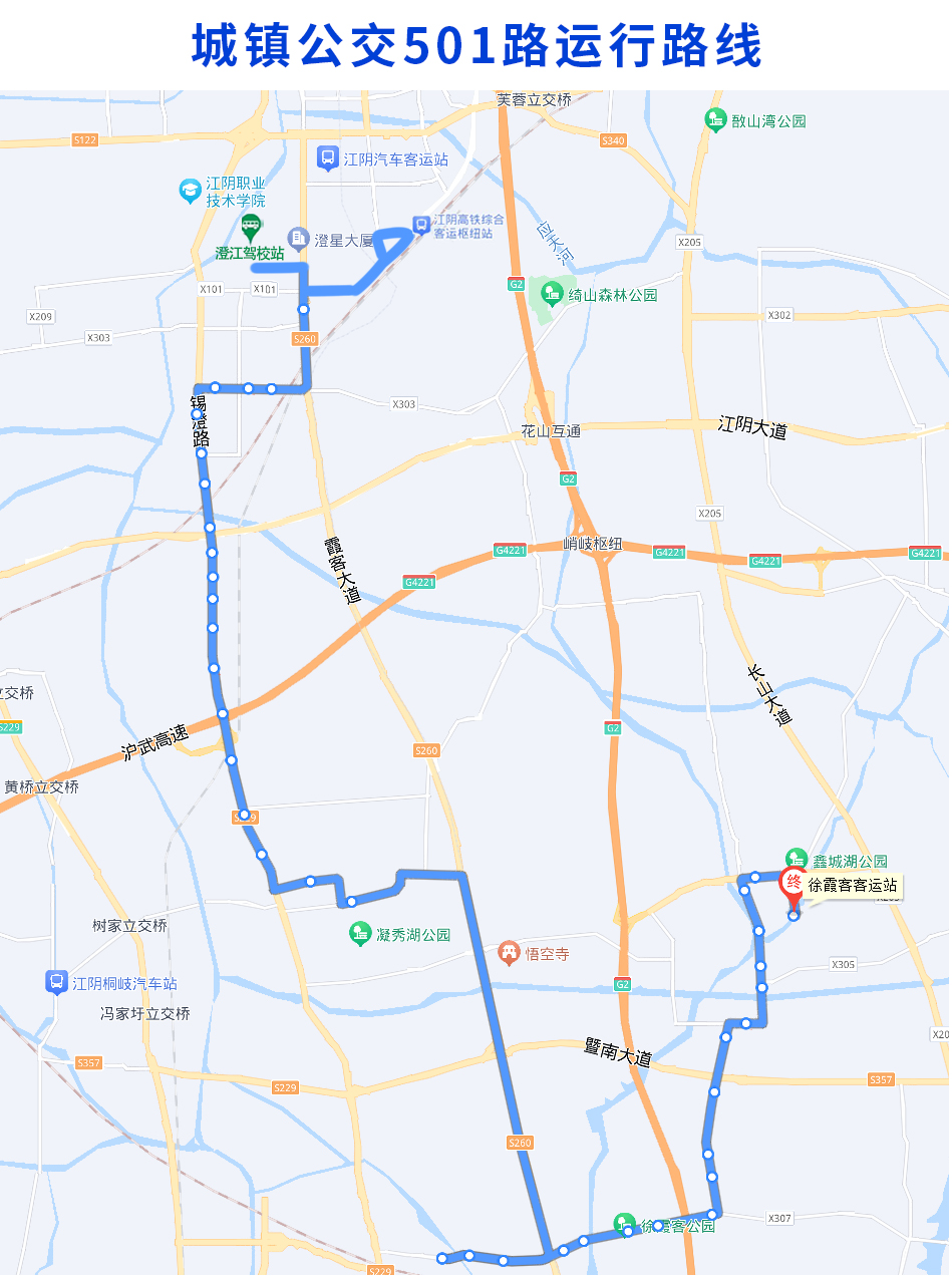 调整后城镇公交501路由澄江驾校站始发,经站西路、霞客大道、大桥南路、霞客大道、云南路、锡澄路、北环路、迎秀路、青璜路、芦塘路、北环路、霞客大道、南埠路、西街、东街、马璜路、外环南路、环东路、外环北路、外环东路至徐霞客客运站。