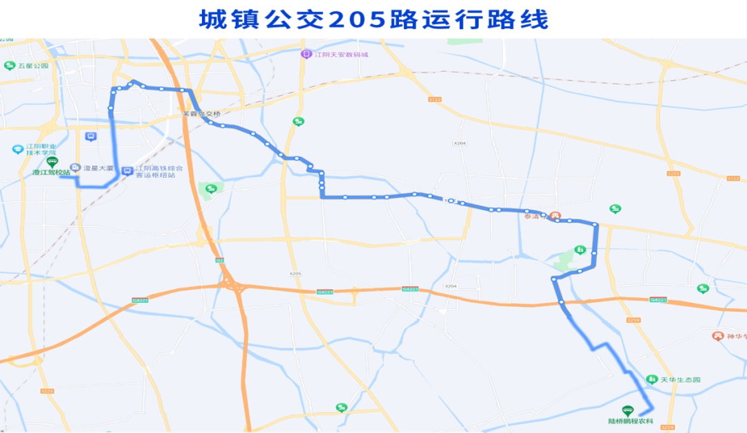 调整后城镇公交205路由澄江驾校站始发,经站西路、霞客大道、大桥南路、花山路、环城南路、文定路、人民东路、澄杨路、山庄路、太平路、云顾路、澄鹿路、双桥路、陆瓠西路、陆西大街、陆东大街、新丰路、大住基至终点陆桥鹏程农科。