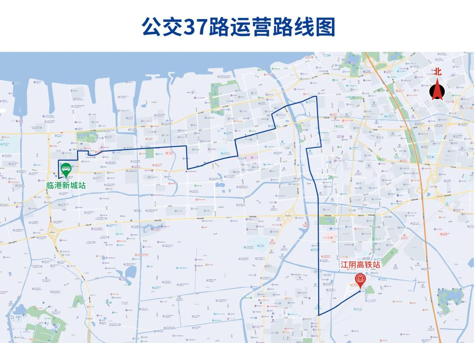 公交37路临港新城站始发,沿镇澄路—浦江路—疏港路—香江路—五星路—夏东路—青山路—普惠路—五星路—通渡北路—澄江西路隧道—中山路—南街—环城西路—梅园大街—霞客大道—大桥南路—西桥路至江阴高铁站。