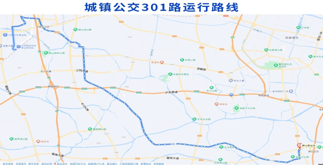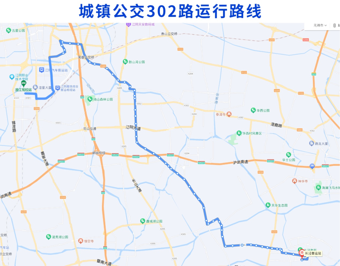 调整后城镇公交302路由澄江驾校始发,经站西路、霞客大道、大桥南路、花山路、毗邻东路、绮山路、人民东路、澄杨路、山庄路、太平路、云顾路、镇北路、人民南路、云顾路、环西路、人民中路至终点站长泾客运站。