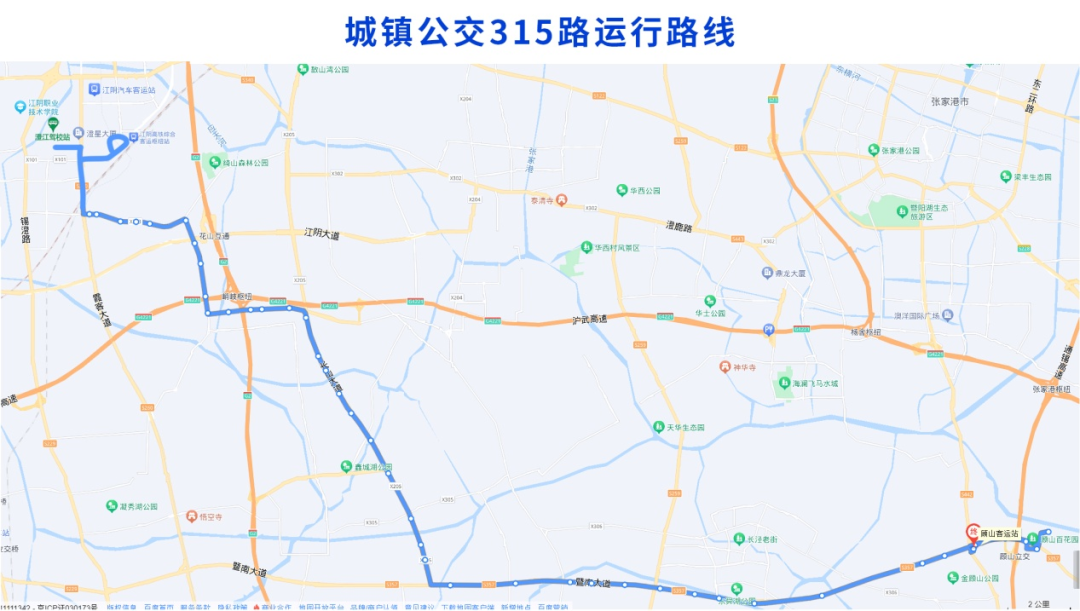 调整后城镇公交315路由澄江驾校站始发,经站西路、霞客大道、大桥南路、霞客大道、云南路、花峭路、迎宾路、长山大道、暨南大道、永安路、红豆路、桃园路、老红豆路、暨南大道至终点站顾山客运站。