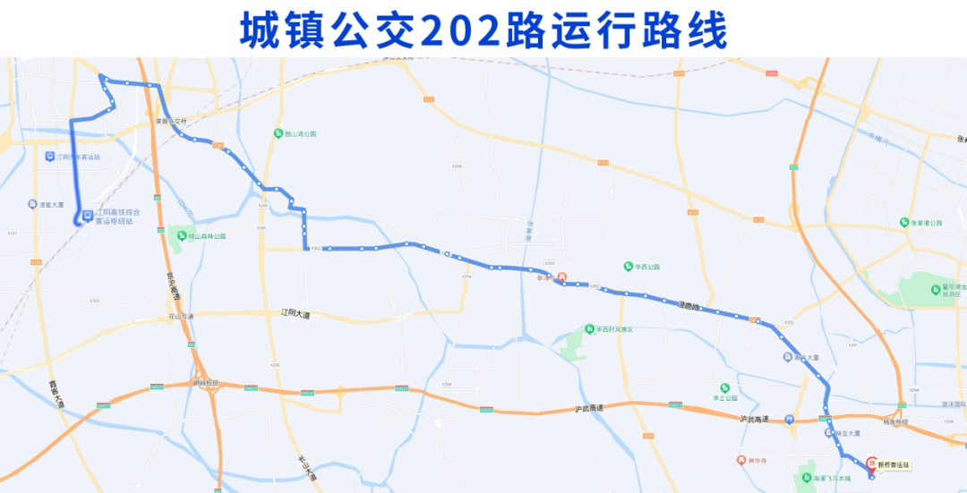 调整后的城镇公交202路由江阴高铁站始发,经大桥南路、花山路、毗陵东路、绮山路、人民东路、澄杨路、山庄路、太平路、云顾路、澄鹿路、新华路、陶新中路、新蕾路、东环路至终点站新桥客运站。