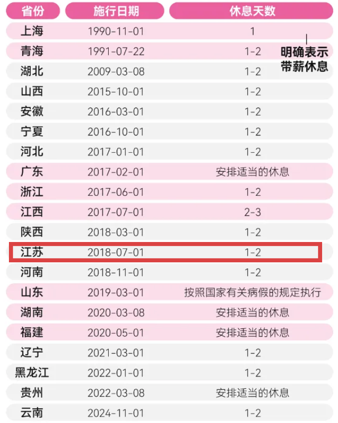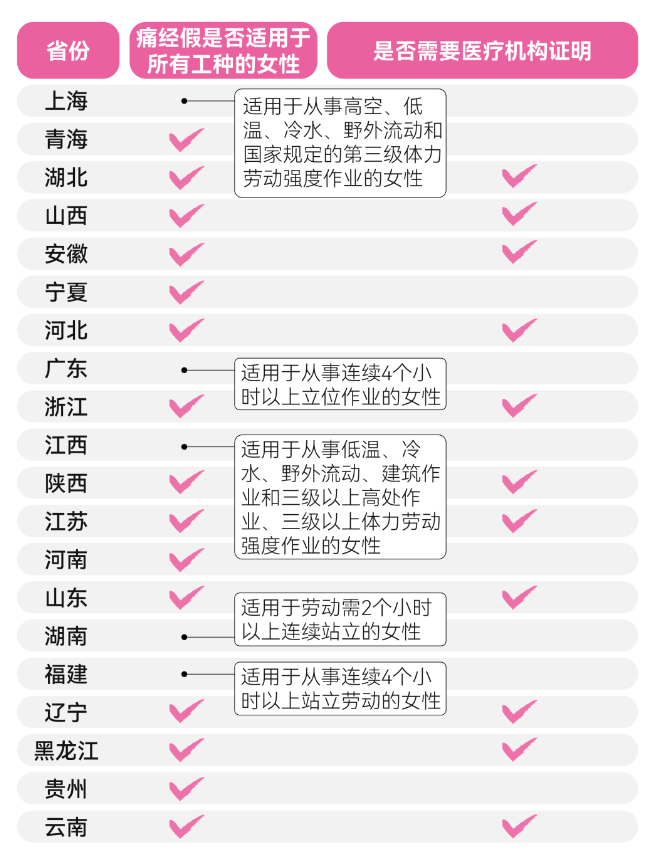 早在1993年,由原卫生部、全国总工会等5个部门联合颁布的《女职工保健工作规定》中,就有类似的规定。该规定指出,患有重度痛经及月经过多的女职工,经医疗或妇幼保健机构确诊后,月经期间可适当给予1至2天的休假。此后,多地纷纷出台相关政策,确保女性职工的这一权益得以落实。据不完全统计,目前,包括北京、上海、陕西、江苏、山东、四川、江西等在内的全国近20个省份都在地方性规定中明确了这一权益。