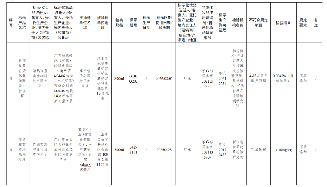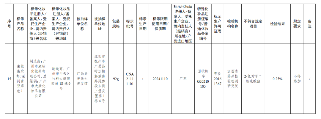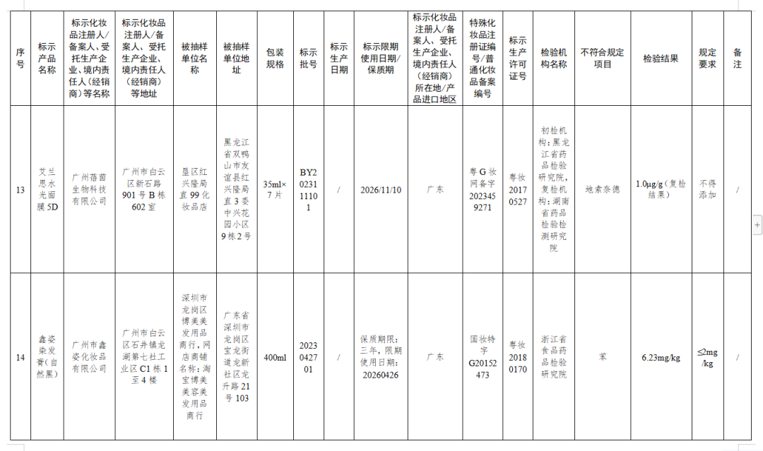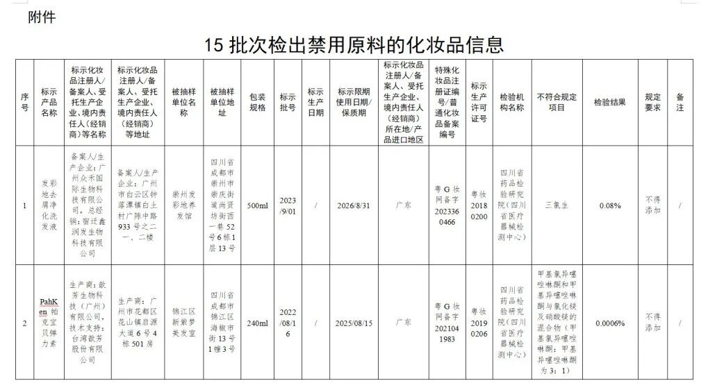 国家药监局12月4日发布通告,通告指出,在2024年国家化妆品抽样检验工作中,经四川省药品检验研究院等单位检验,产品标签标示名称为发彩地去屑净化洗发液等15批次化妆品不符合规定,检出《化妆品安全技术规范(2015年版)》中规定的禁用原料。
