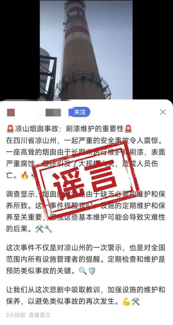 经凉山州应急管理局调查核实,该帖文采用图片为外地烟囱照片,近年来,从未收到过因烟囱失修发生火情造成人员伤亡事故报告。希望广大网民抵制和举报网络谣言,不信谣,不传谣,共同营造网络清朗空间。