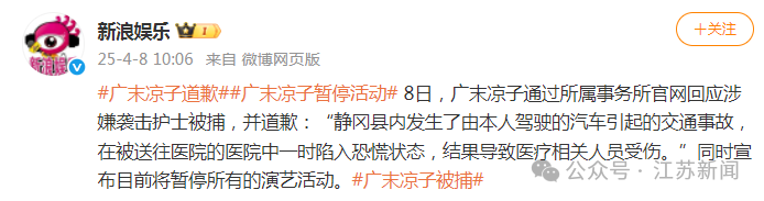8日,广末凉子通过所属事务所官网回应涉嫌袭击护士被捕,并道歉:“静冈县内发生了由本人驾驶的汽车引起的交通事故,在被送往医院之后一时陷入恐慌状态,结果导致医疗相关人员受伤。”同时宣布目前将暂停所有的演艺活动。