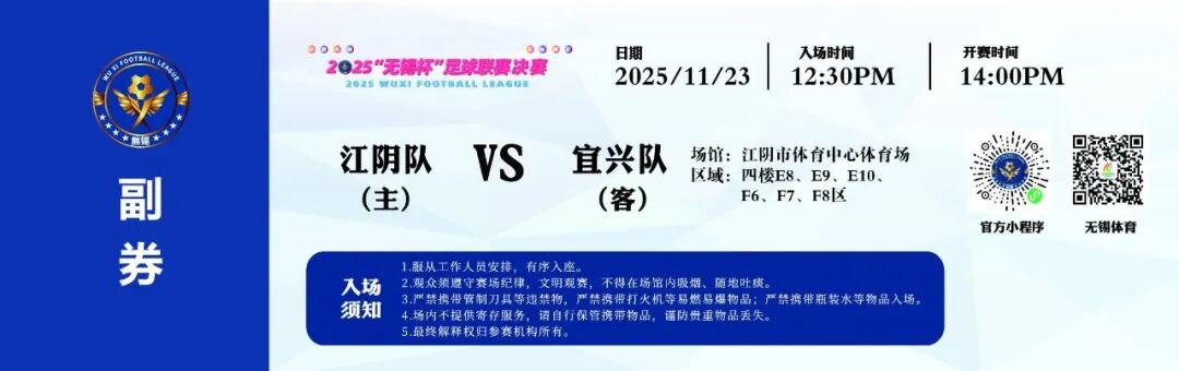 11月23日14:00,2025“无锡杯”足球联赛决赛(第二回合)在江阴市体育中心体育场对决重启,江阴队在主场对战宜兴队,强强对抗直接拉满赛事看点,错过这波绿茵狂欢真的亏!