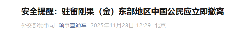 外交部和中国驻刚果(金)使馆郑重提醒:在刚果(金)东部地区特别是南基伍省驻留的中国公民和企业,应立即向中国驻刚果(金)使馆报备信息并撤离该地区。如遇紧急情况,请及时报警并同中国驻刚果(金)使馆联系。