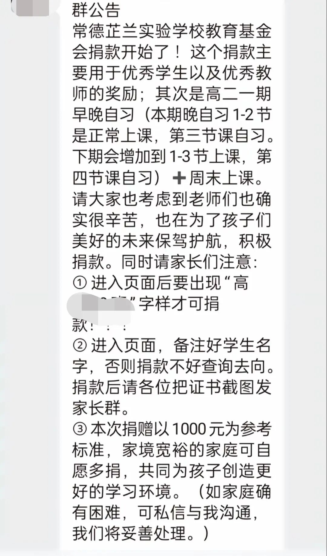 网友发布的群公告内容显示,常德芷兰实验学校教育基金会捐款主要用于优秀学生以及优秀教师的奖励,其次为老师上自习和周末上课的奖励费用。捐赠以1000元为参考标准,家庭宽裕的家庭可自愿多捐,共同为孩子创造更好的学习环境。请大家考虑到老师们很辛苦,也在为孩子们美好的未来保驾护航,积极捐款。