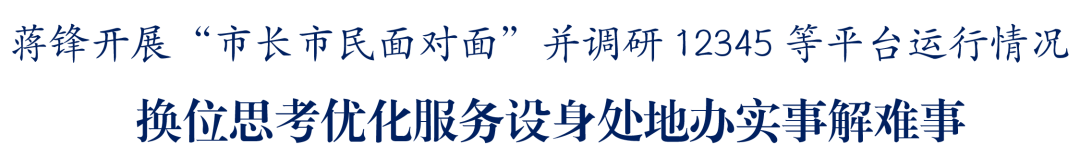 12月30日,市长蒋锋开展今年四季度“市长市民面对面”,并调研12345热线、民声留言板等服务平台运行情况和政务服务工作。他强调,要深入学习贯彻党的二十届四中全会精神,按照省委省政府部署和市委工作要求,走好新时代党的群众路线,换位思考、优化服务,设身处地为企业和群众多办实事、多解难事。市政府秘书长陈寿彬参加活动。