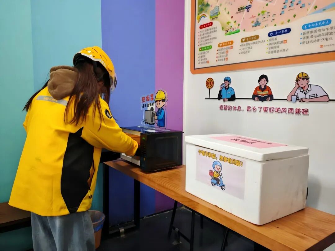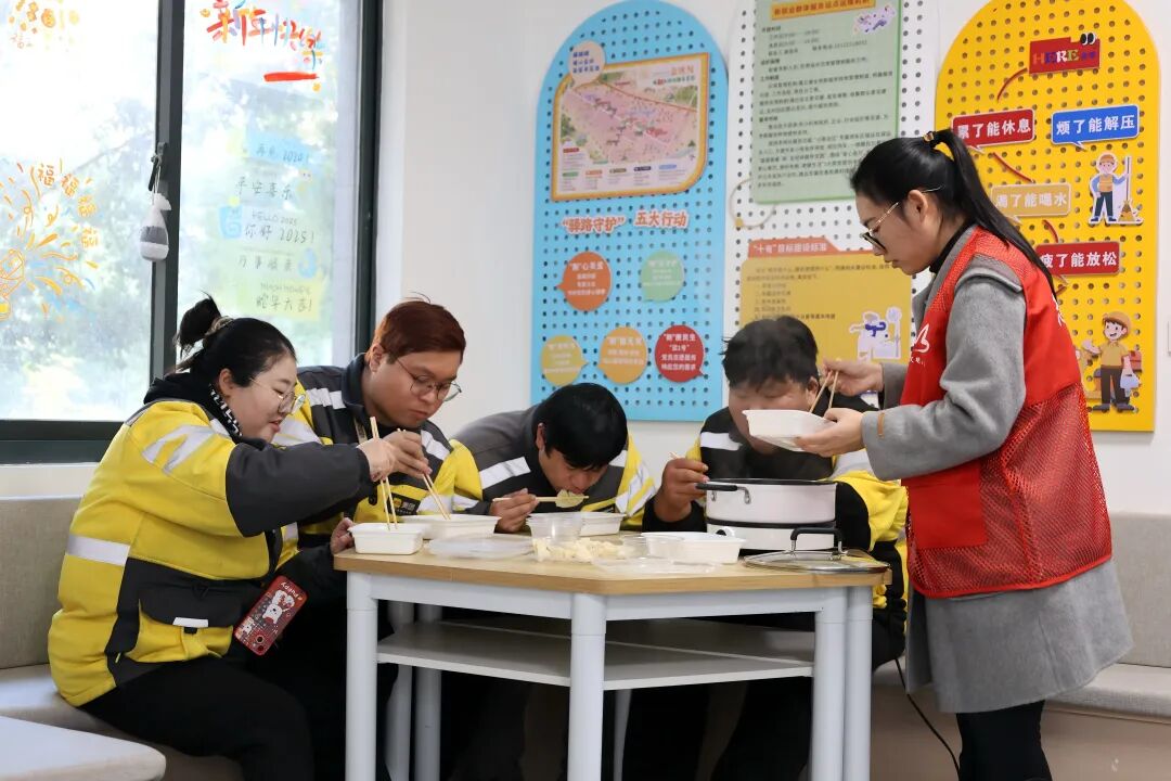驿站内新增了微波炉、保温箱等便利设施,确保骑手们能随时吃上热餐、喝到热水,温暖从掌心传至心底。赶上订单间隙,社区工作人员还会为大家端上一碗碗刚煮好的馄饨,热气腾腾,香气四溢。众人围坐,边吃边聊,寒意被驱散,也营造了关心关爱新就业群体的良好氛围。