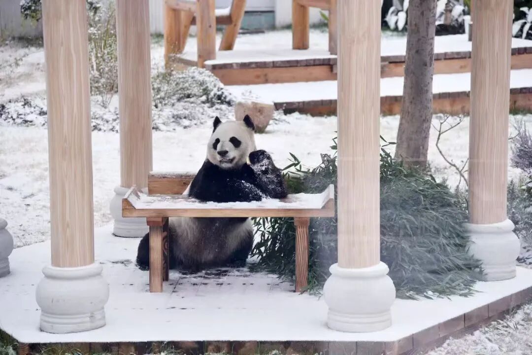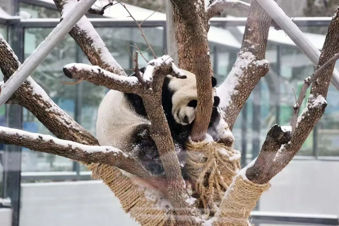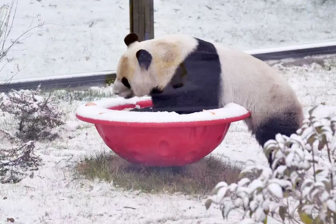 熊猫馆的外场早已是一片银白。天生怕热喜冷的“渝宝”和“加悦悦”,这下可算迎来了最畅快的时候。只见它们在雪地里翻滚撒欢,在转碗里扭动着圆滚滚的身子,又爬到积了雪的树干上攀上跃下……一番活泼泼的“运动套餐”下来,两只“大猫”果然食欲大开。