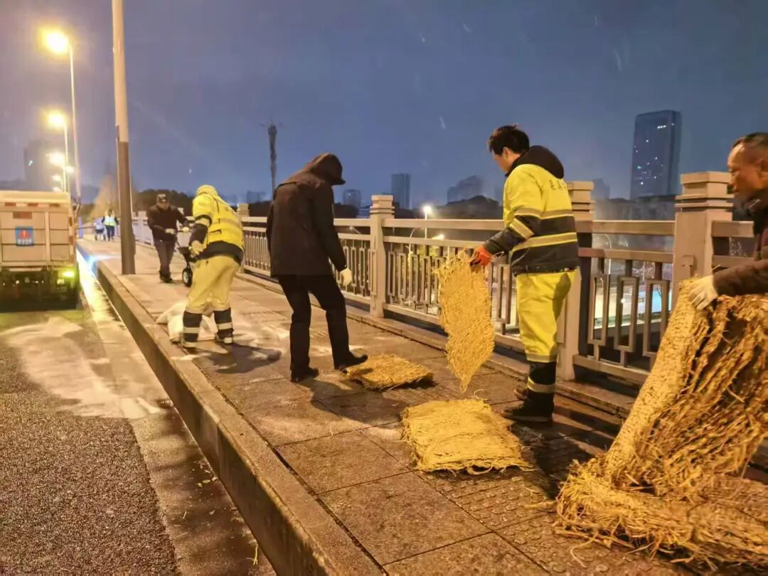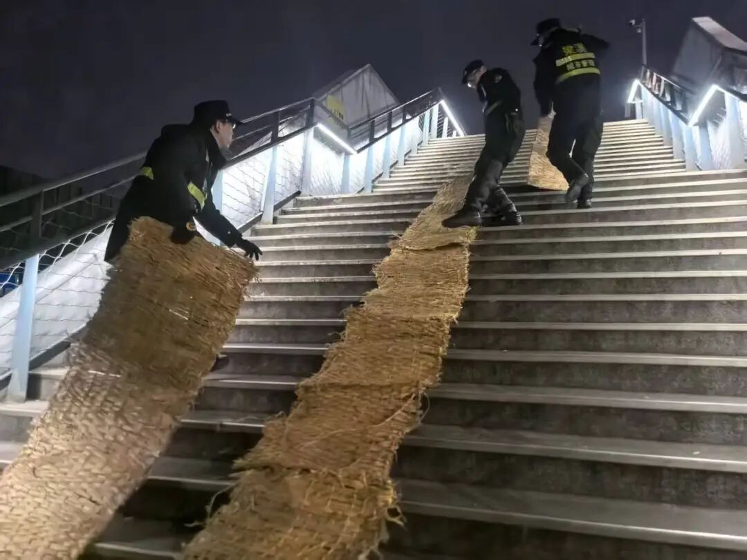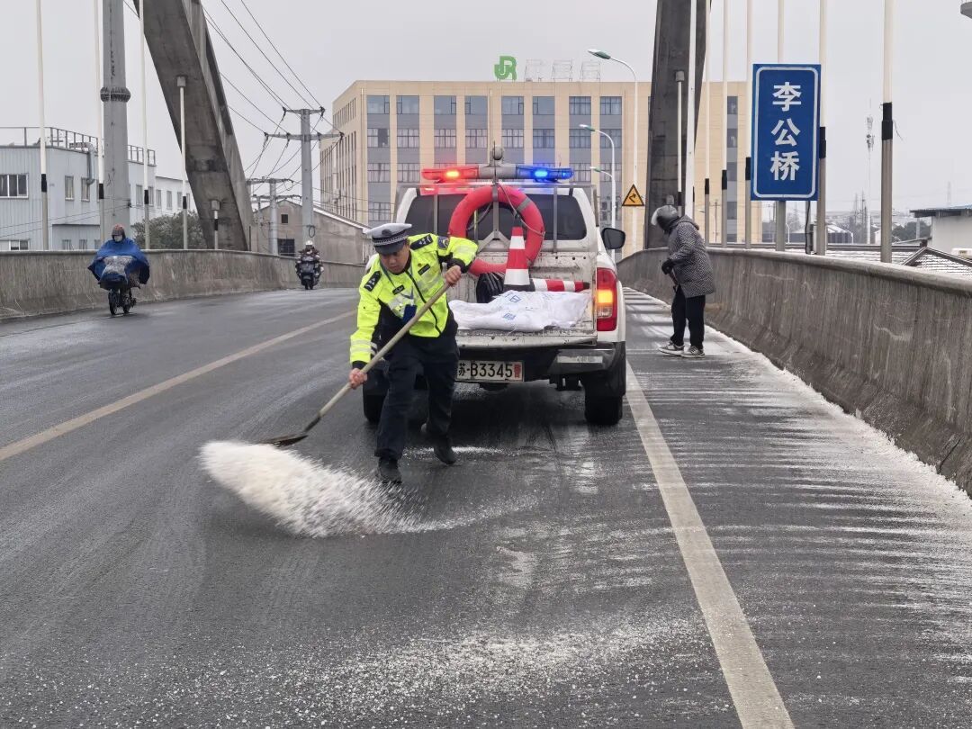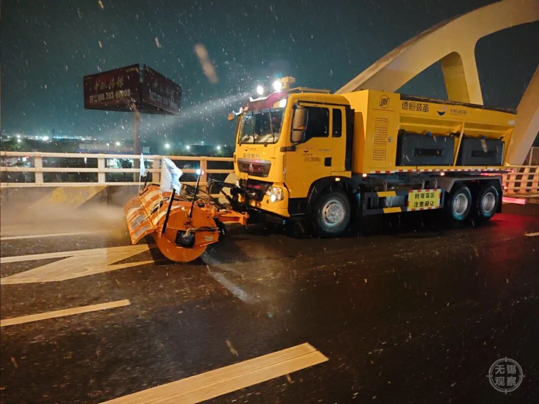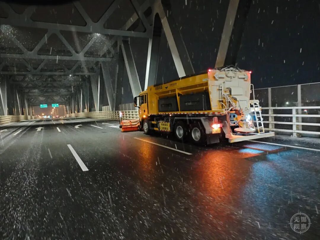 在梁溪区高桥,作业车辆缓慢前行,在桥面撒布融雪剂;在青祁桥、盛新大桥等桥梁,城管、环卫队员手持推雪铲、铁锹,细致清理薄雪;在医院、学校门口,防滑草垫已在台阶和坡道上铺设到位。