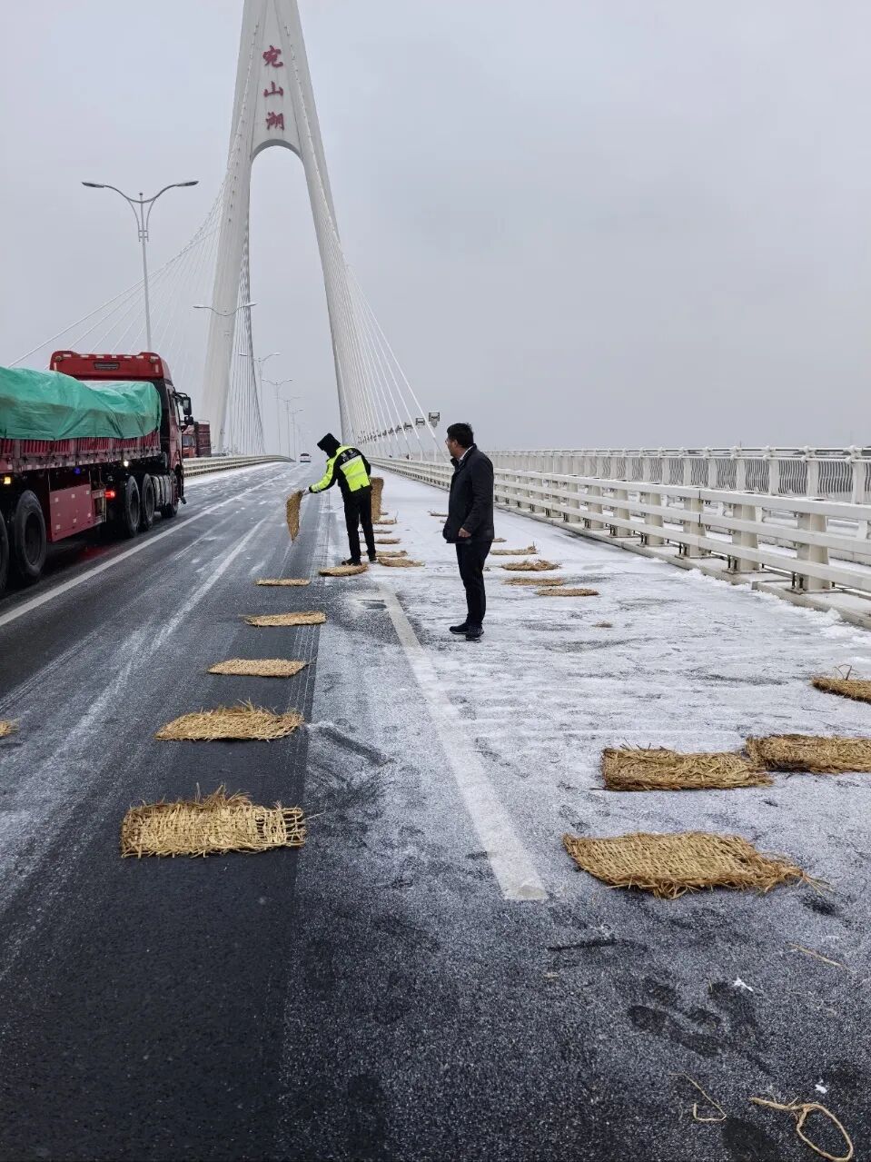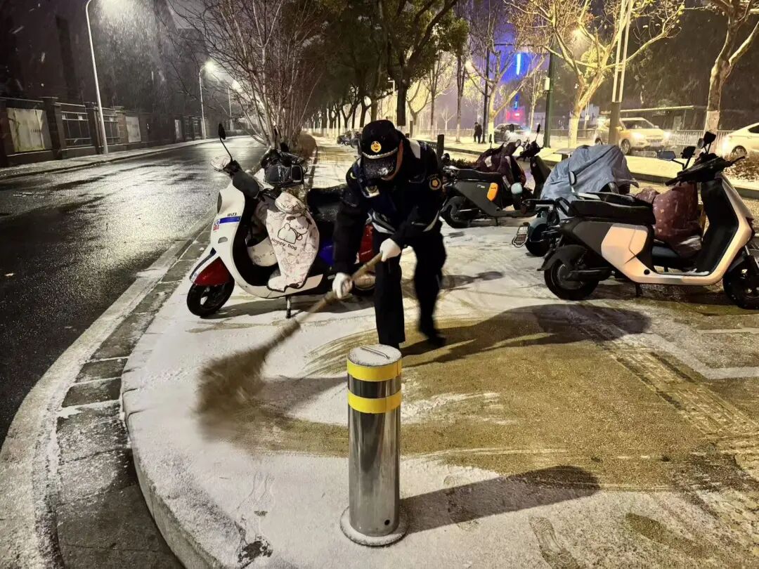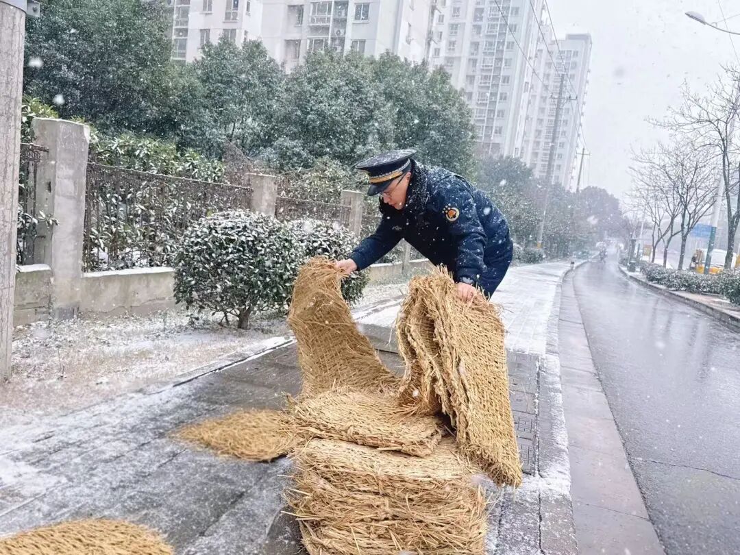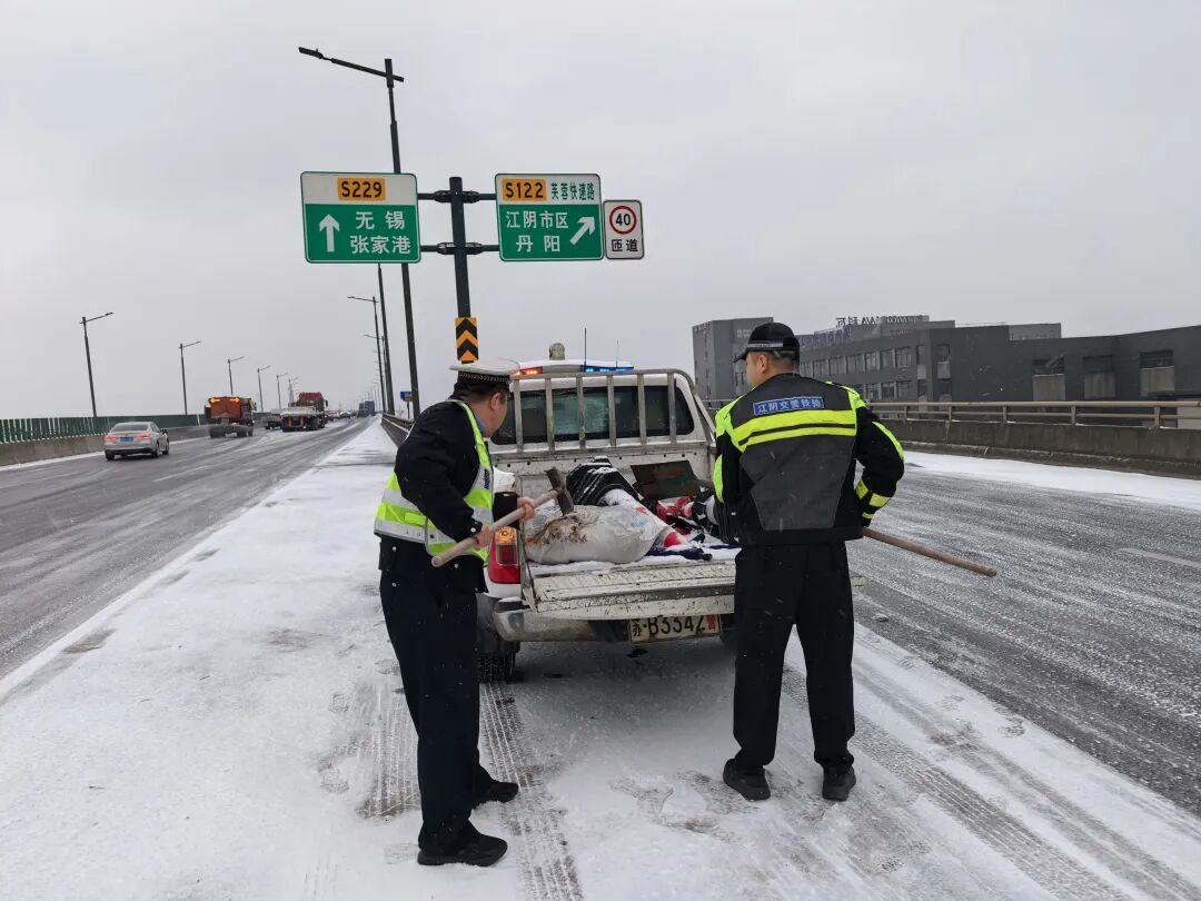 在梁溪区高桥,作业车辆缓慢前行,在桥面撒布融雪剂;在青祁桥、盛新大桥等桥梁,城管、环卫队员手持推雪铲、铁锹,细致清理薄雪;在医院、学校门口,防滑草垫已在台阶和坡道上铺设到位。