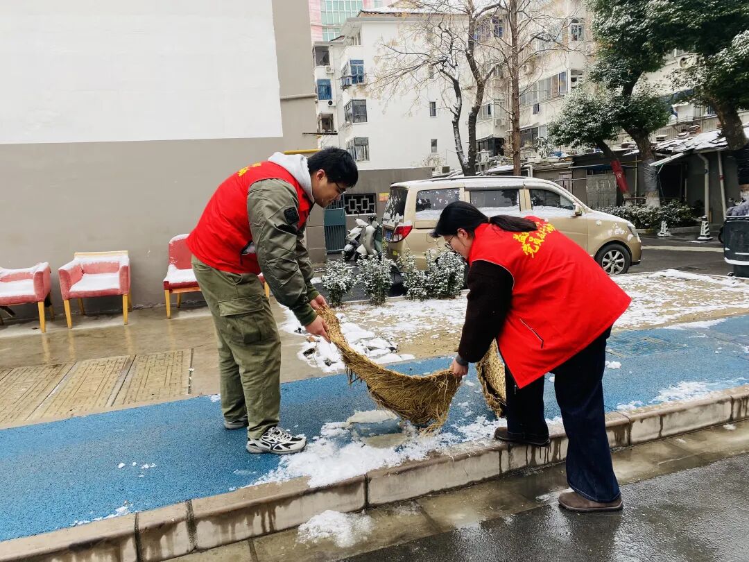 雨雪天气来袭,丁村社区党员志愿者与网格员迅速行动,一方面为辖区独居老人上门送上新鲜蔬菜与肉类,保障老人日常饮食需求;另一方面对辖区内易积雪结冰的路段提前铺设草席,消除出行安全隐患。