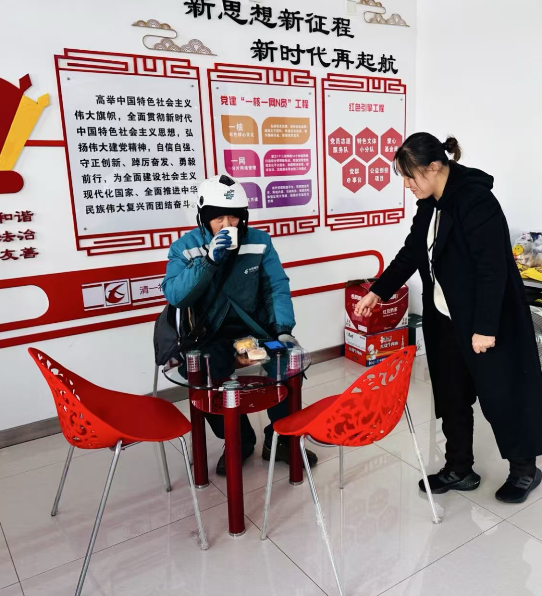 暖意融融的山北街道仁和社区暖新驿站,在雨雪天里,成了骑手们歇脚避寒的“暖心站”。