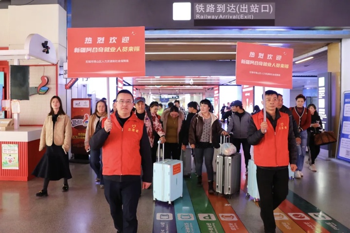 交汇点讯 人勤春来早!2月21日年初五,中午11点24分,随着Z036次列车驶进无锡站,16名从新疆阿合奇县来锡务工人员顺利抵达。这是无锡马年春节后第一批“点对点”返岗的务工人员。