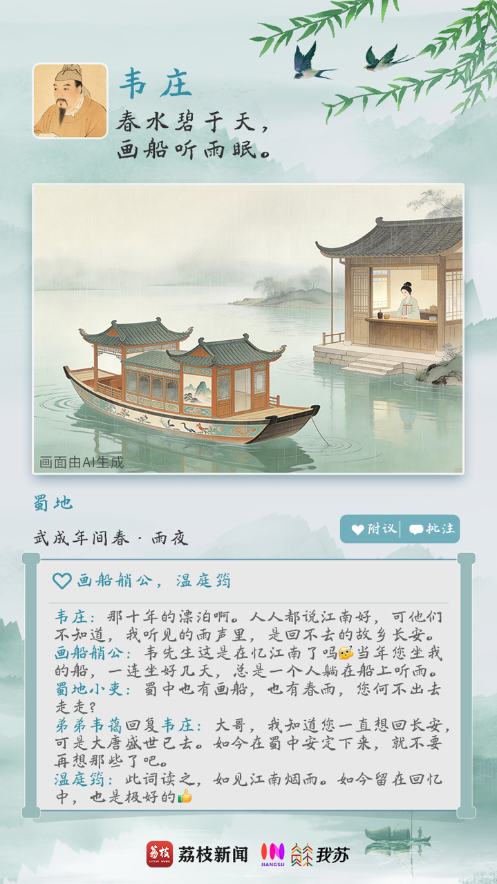 假如古人们也喜欢发朋友圈,这江南的春色定会展现出别样的诗情画意。春景无限,滋味万千。古人的春天里又藏着多少种思绪?今天,穿越古今,用AI将诗句具象化,在八位文坛大V的“朋友圈”里,感受一番他们笔下各不相同的春日心境。