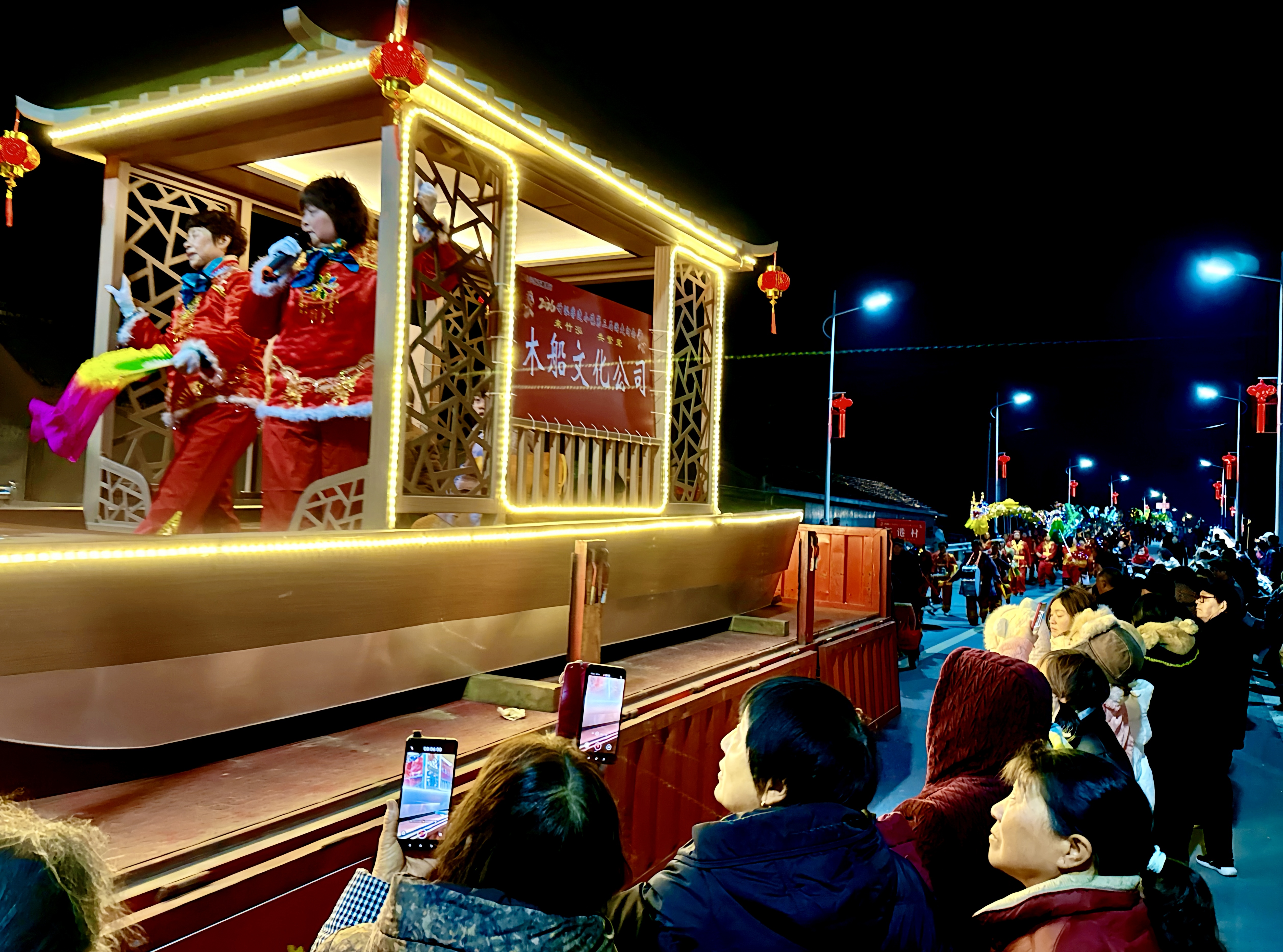 千垛花海迎接八方来客,一艘艘装饰着彩灯的木船缓缓“游”动,船上锣鼓喧天,舞龙队伍穿梭其间,欢腾的人群紧随其后,将水乡的节日氛围推向高潮。