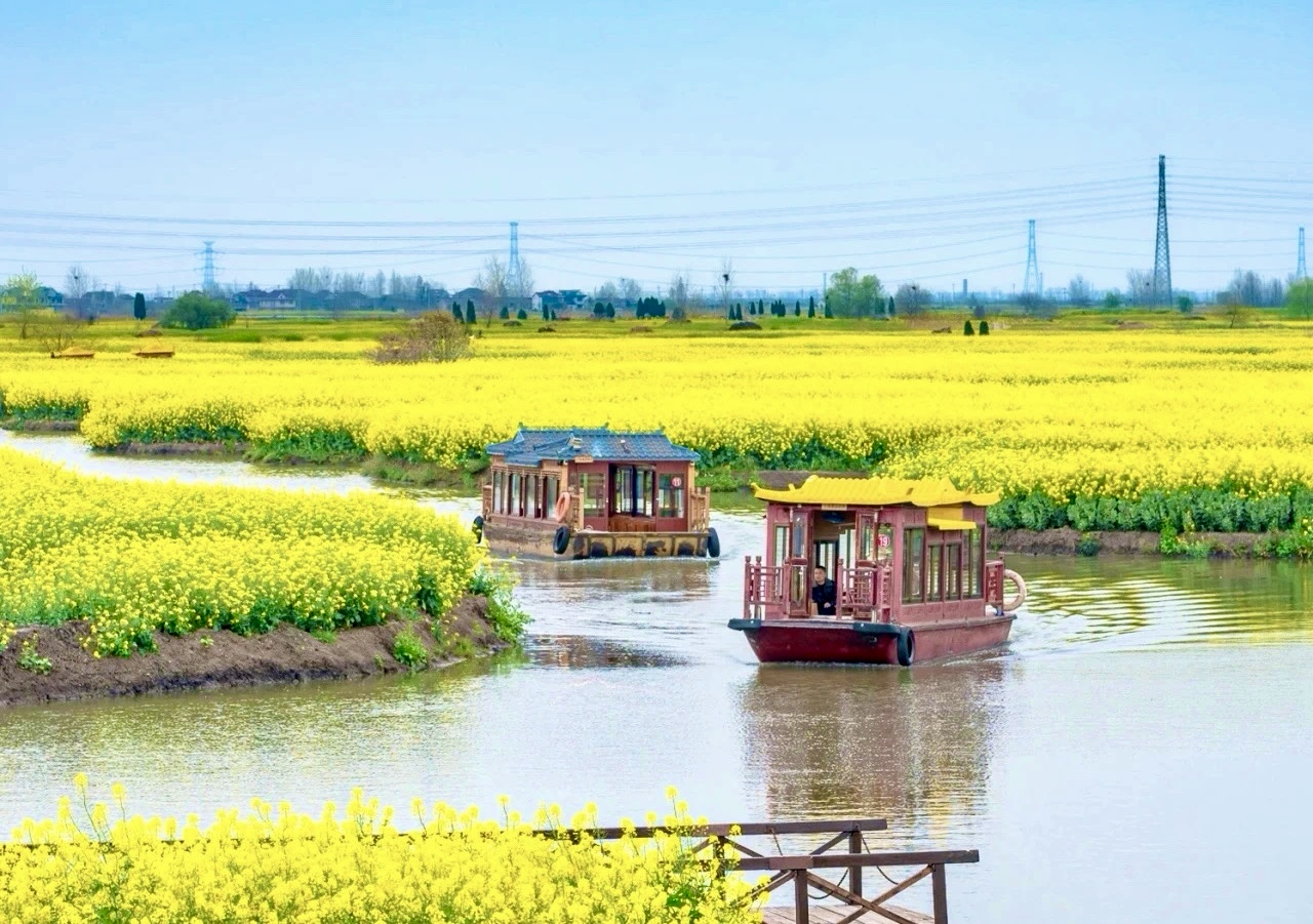 最能诠释这种融合的,莫过于千垛菜花景区的水上风景,也是打开垛田的最佳方式。每年春天,数十艘古色古香的竹泓木船穿行于“千岛”垛田之间,船桨划破金黄倒影,船娘哼唱水乡小调,游客乘船赏花。木船不再是陈列馆里的展品,而成为垛田景观中流动的灵魂;垛田也不再是远观的生态画卷,而是可进入、可体验的“水上生活空间”。