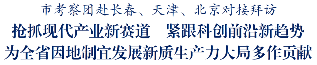 4月8日至10日,市委书记杜小刚带队先后赴长春、天津、北京对接拜访,旨在深入学习贯彻习近平总书记对江苏工作重要讲话精神和全国两会精神,全面融入和服务国家重大发展战略,加强与北京(京津冀)国际科技创新中心建设、东北全面振兴等战略对接,认真落实省委、省政府部署要求,学习先进经验、深化交流合作,抢抓现代产业新赛道,紧跟科创前沿新趋势,为全省因地制宜发展新质生产力大局多作贡献。市领导王凯、张镇、周文栋一同考察或拜访。